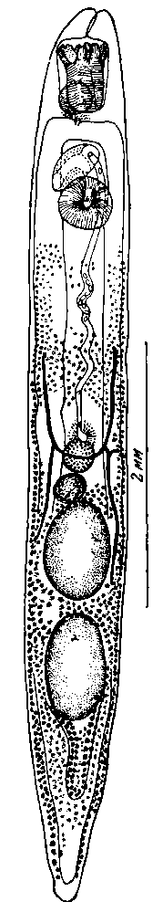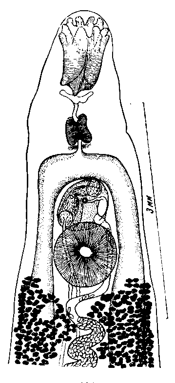 Наружная мускулатура (круговая, продольная, диагональная) мощно развита. Ротовая присоска, достигающая около 1 мм длины и 0,6 мм ширины, имеет обширную полость, куда могут входить десять предротовых, закругленных, коротких выростов: две пары дорзальных, две пары латеральных, одна пара крупных вентральных. Брюшная присоска, 0,92 мм в диаметре, расположена несколько позади кишечной бифуркации, ее передний край находится на расстоянии 3 мм от переднего конца тела.
