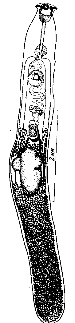 Боковые желточные ходы образуют желточный резервуар, довольно объемистый, расположенный у задне-дорзального края яичника. Семяприемник лежит дорзально от яичника. Имеется, по-видимому, маточный семяприемник. Тельце Мелиса располагается медианно и непосредственно впереди яичника. Матка описывает свои извивы между кишечными стволами, проходит дорзально от левого края брюшной присоски и доходит до полового отверстия. Яйца достигают 0,707x0,039 мм.