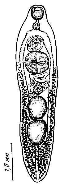 Яичник трехлопастной, находится непосредственно впереди семенников, медианный. Семяприемник дорзальный по отношению к яичнику. Желточники простираются от уровня кишечной бифуркации до заднего конца тела; латеральные, дорзальные и вентральные по отношению к кишечным стволам; заполняют пространство кзади от семенников. Матка, неровно свернутая между задним краем яичника и брюшной присоской, с относительно толстыми стенками; метратерма нет; матка соединяется с циррусом близко от полового отверстия. Яйца с тонкой оболочкой, 0,054— 0,065x0,034—0,038 мм, обычно 0,060x0,038 мм, заострены на конце, противоположном крышечке.