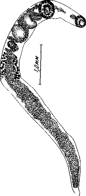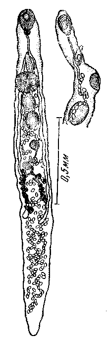 Описание вида (по Denton, Byrd, 1951). Тело тонкое, прозрачное, вытянутое, с почти параллельными сторонами, закругленным, передним, и суживающимся, задним, концами, достигает 1,43—2,18 мм в длину и 0,17—0,20 мм в ширину (в области между задним семенником и желточниками). Кутикула тонкая, без шипов, с тонкой поперечной исчерченностью и мелкими чувствительными сосочками по краям тела у некоторых экземпляров. Ротовая присоска субтерминальная по отношению к небольшому выступу, похожему на губу, расположенному на переднем конце тела; она слабомышечная, имеет форму вытянутого овала и достигает 0,10—0,13 мм в длину и 0,08—0,10 мм в ширину.