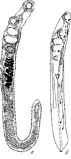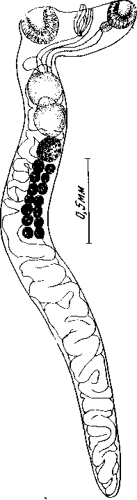 Желточники начинаются за семеприемником, не только располагаясь по бокам тела, но и всю область тела заполняя довольно плотно; однако позади часто формируется один маленький вырост, в результате чего весь массив желточников выглядит асимметрично; желчные фолликулы довольно крупные, комковатые, расположены в передней части тела (область от брюшной присоски до ротовой присоски). Область гонад и область желточников имеют примерно одинаковую длину, в плотно заполненной маткой задней части тела они также примерно одинаковой длины. Яйца частично уже эмбрионированные, размеры яиц 0,032— 0,042 X 0,018—0,025 мм, экскреторный пузырь I-образный, достигает примерно середины области желточников; тип строения экскреторной системы плагиорхоидный, экскреторная формула протонефридий 2 (24-2 + 2) + (2 + 2+2) = 24.