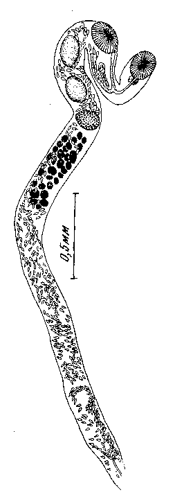Петли матки очень сильно скручены, они заполняют большую часть тела кзади от желточников. Передние петли матки проходят вентрально по отношению к середине или к какому-либо краю яичника, затем направляются к дорзальной стороне тела, проходят между задним семенником и яичником, с правой или левой стороны от заднего семенника; далее они проникают между семенниками, проходят дорзально от брюшной присоски, образуя несколько петель, прежде чем достигнут полового отверстия. Количество зрелых яиц невелико, цвет их коричневый, размер достигает 0,039—0,044 мм в длину и 0,022—0,028 мм в ширину.