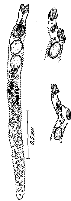 Овальный яичник, размером 0,24—0,32 X 0,18—0,30 мм, располагается по средней линии тела на расстоянии 0,1—0,3 мм от заднего края второго семенника. Позади яичника наблюдается ясно выраженный receptaculum seminis. Желточники, располагаясь во второй трети тела, состоят из крупных немногочисленных фолликулов и занимают латеральные поля тела. Протяженность желточника 0,94—0,40 мм. До заднего конца тела они не доходят на 2,06—3,2 мм. Желточники начинаются на уровне яичника или несколько кзади от него.