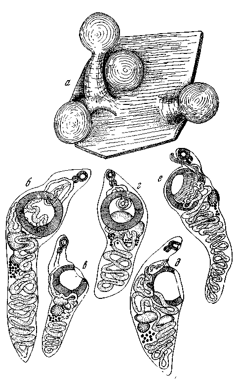 a — выпячивания на наружной стенке желчного пузыря стрижа; б — е — мариты на разных стадиях развития