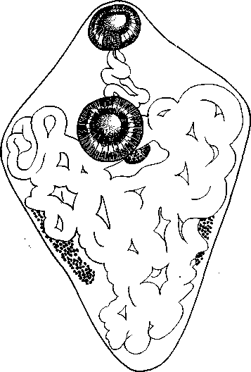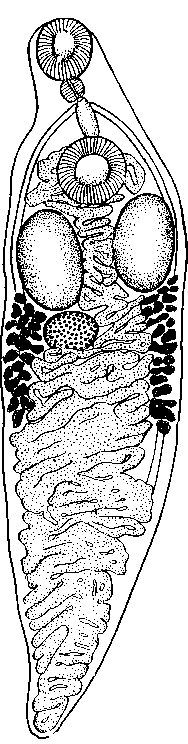 Половая бурса небольшая, грушевидной формы, размером 0,52 X 0,21 мм. Ее дно прикрыто передним краем брюшной присоски. Половое отверстие около заднего края фаринкса. Семенники округлой формы, расположены несколько асимметрично около заднего края брюшной присоски. Диаметр правого семенника 0,39 мм, левого 0,39x0,47 мм. Яичник слегка овальной формы. Он крупнее семенников и лежит на довольно значительном расстоянии от последних, в левой половине тела. Его размер 0,50 х 0,44 мм. Семенники и яичник разделены петлями матки. Тельце Мелиса и семеприемник располагаются рядом с яичником. Желточники состоят из крупных фолликулов. Они начинаются почти на уровне яичника, на расстоянии 3,048 мм от заднего конца тела. Справа их протяженность равна 1,40, слева — 1,52 мм.