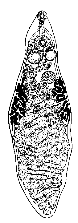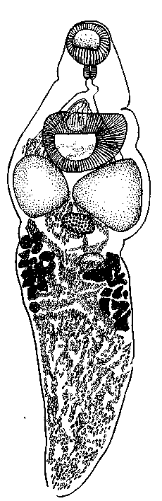 Субтерминальная ротовая присоска слегка овальной формы, величина ее 0,221—0,442 х 0,221—0,408 мм. Брюшная присоска расположена в передней трети тела паразита и задним краем соприкасается с передними границами семенников. Размеры брюшной присоски 0,510—0,629x0,578— 0,765 мм. Расстояние от переднего конца тела до брюшной присоски 0,765—1,105 мм. Имеется небольшой фаринкс — 0,102—0,170 X 0,102— 0,136 мм. Короткий пищевод посередине расстояния между присосками делится на два кишечных ствола, закрытых желточными фолликулами и густыми петлями матки, из-за которых проследить дальнейшее продолжение кишечных ветвей не представляется возможным.