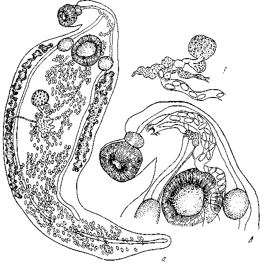 a — общий вид; б — передний конец тела; в — женская половая система