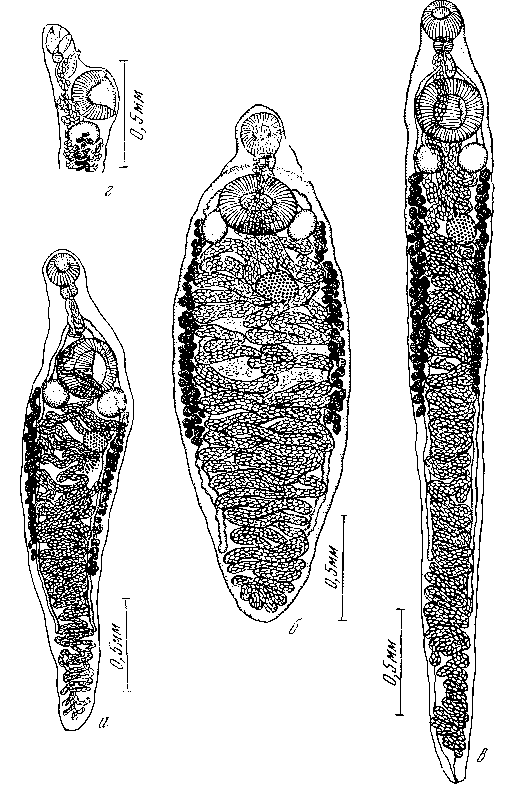 Ротовая присоска мышечная, достигает 0,13—0,20 мм в диаметре, субтерминальная по положению. Имеется дорзально расположенный довольно выпуклый, похожий на губу выступ. Брюшная присоска мышечная, с глубоким чашеобразным просветом, значительно крупнее ротовой присоски. Диаметр брюшной присоски 0,25—0,40 мм, расположена она в первой четверти тела. Соотношение диаметра ротовой присоски к диаметру брюшной присоски варьирует в пределах от 1 : 1,7 — 1 : 2,19.