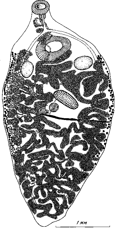 Он отделен от семенников большим пространством, заполненным петлями матки. Шаровидный семеприемник расположен непосредственно позади яичника. Матка мощно развита, ее плотные петли занимают все тело позади брюшной присоски. Терминальная часть матки образует две или три петли впереди от брюшной присоски.