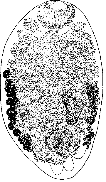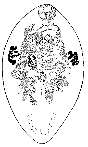 Семенники лежат по бокам брюшной присоски. Правый семенник овальной формы, достигает 0,102 х 0,064 мм, левый семенник круглый, его диаметр равен 0,072 мм. Семенной пузырек и половое отверстие не были заметны на препарате.