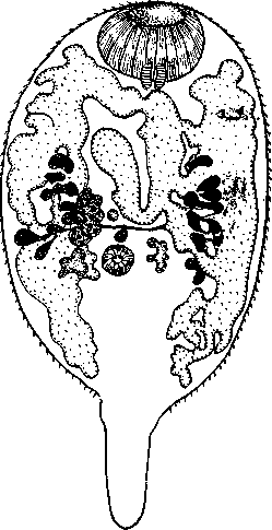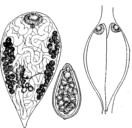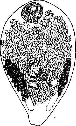Описание вида (по Быховской-Павловской, 1950). Округлая форма тела, размеры 0,83—1,45 X 0,57—0,97 мм. Хвостовой отросток червеобразный, находится в разной степени сокращения, 0,13—0,52 X 0,05—0,18 мм. Крупная ротовая присоска с сильно редуцированной мускулатурой, 0,21—0,35 X 0,29—0,5 мм. Брюшная присоска меньших размеров, плохо видимая, расположена в задней половине тела. Два ряда крупных скоплений желточных фолликулов идут почти параллельно от заднего края ротовой присоски до начала хвостового отростка, на значительном расстоянии от боковых краев тела. Это сближение желточников в направлении к срединной линии характерно для вида. Матка очень сильно развита, полностью заполняет своими петлями все тело, прикрывая внутренние органы. Яичник и семенники, насколько можно судить по переполненным яйцами экземплярам, средних размеров, лопастной формы и обычного расположения. Яйца достигают 0,034 х 0,017 мм.