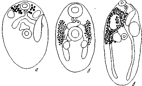 Схема расположения протоков женской половой системы у плеурогенид (по Fuhrmann, 1928)