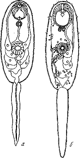 а — Pleurogenoides medians (по Гинецинской, 1959), б — Mosesia chordeilesia (по Hall, 1959)