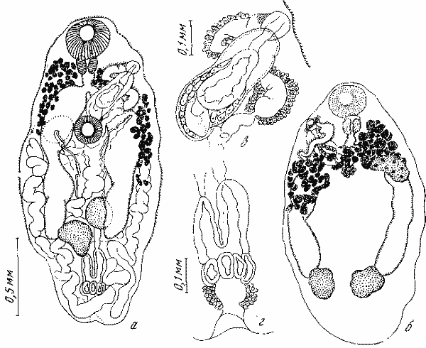 a — общий вид, 5 —- то же, с дорзальной стороны, в — строение бурсы, г — строение выделительного пузыря