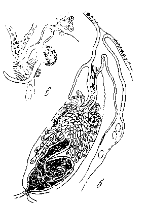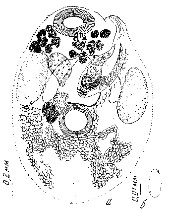 a — из кишечника Rana temporaria (окрестности Костромы, оригинал), б — строение бурсы, в — строение женской половой системы (б,в —по Looss, 1894)
