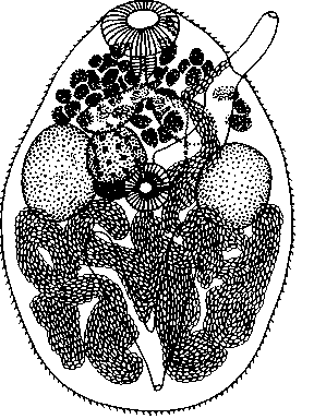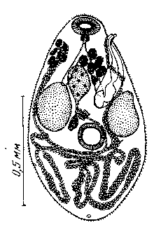 Описание вида. Тело округлое, поперечно- или продольноовальное, грушевидное или яйцевидное, 0,46—0,84 X 0,37—0,77 мм. Кутикула покрыта шипиками, которые в задней половине тела становятся более редкими. Ротовая присоска 0,08—0,14 X 0,11—0,21 мм, терминальная, реже субтерминальная, брюшная—0,09—0,19 X 0,11—0,18 мм, экваториальная или несколько пре- или постэкваториальная. Предглотка отсутствует. Глотка 0,03—0,06 мм в поперечнике. Пищевод отсутствует или может достигать 0,05 мм в длину. Ветви кишечника 0,13—0,16 мм длиной, как правило не доходят до середины семенников. Ветви выделительного пузыря достигают уровня семенников.