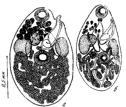 a— из кишечника Rana vittigera (Филиппины, по Tubanjui. 1928), б — из кишечника R. hexadactyla (Индия, по Klein, 1905)