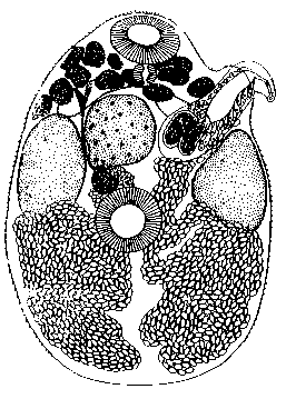 Семеприемник 0,04—0,08 мм в поперечнике, расположен постовариально между яичником и брюшной присоской. Желточники прецекальные, содержат небольшое количество фолликулов (6—8), довольно крупных и собранных в две розетки в передней четверти тела. Матка посттестикулярная, достигает уровня середины брюшной присоски. Метратерм слабомускулистый. Яйца с крышечкой, 0,017—0,025 X 0,01 — 0,014 мм (обычно 0,02—0,022 X 0,014).
