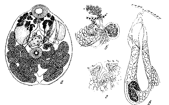 a — общий вид, б — строение протоков женской половой системы, в — строение бурсы, г — поперечный срез через область полового отверстия