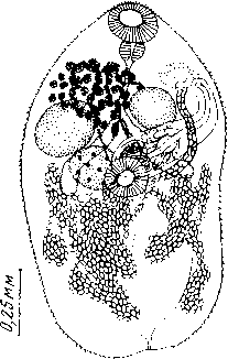 Prosotocus partapus Kaw, 1950 из кишечника Rana cyanophlyctis (Индия, по Kaw, 1950)
