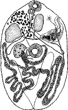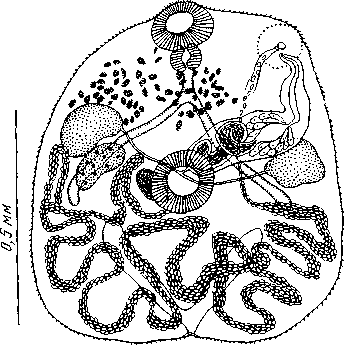 Семенники овальной или неправильной формы, 0,15—0,16 X 0,13— 0,2 мм, расположены асимметрично: левый семенник больше смещен кпереди и приближен к пищеводу. Бурса ретортовидная, 0,37—0,38x0,15 мм, ее проксимальный конец не достигает брюшной присоски. Бурса содержит хорошо выраженный свернутый семенной пузырек, округлую простатическую часть, короткий семяизвергательный канал и циррус. Мужское половое отверстие маргинальное, слева, на уровне переднего края левого семенника. Яичник овальный или несколько неправильной формы, 0,13—0,14 X 0,1 мм, расположен полностью интрацекально, между правой ветвью кишечника и брюшной присоской.