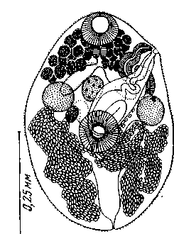 Описание вида (по Manter, Pritchard, 1946). Тело овальное, 0,61—0,93 X 0,39—0,6 мм, с наибольшей шириной примерно в средней части. Кутикула покрыта мелкими, округлыми шипиками или чешуйками. Ротовая присоска субтерминальная, 0,07—0,12 X 0,09—0,13 мм; брюшная 0,07—0,12 X 0,1—0,14 мм, расположена преэкваториально в передней части средней трети тела. Глотка овальная, 0,04—0,06 мм в поперечнике, расположена непосредственно позади ротовой присоски. Пищевод 0,04— 0,06 мм длиной. Бифуркация примерно посередине между присосками. Ветви кишечника не достигают уровня брюшной присоски. Ветви выделительного пузыря оканчиваются медианно от семенников, на уровне их середины, пора терминальная.