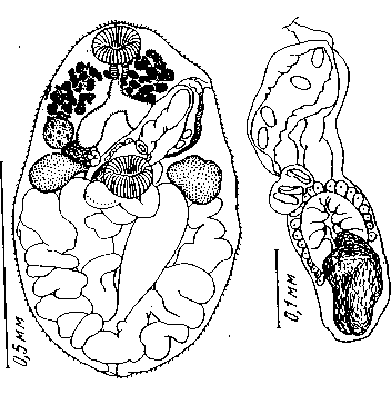 Семенники округлые или неправильной формы, 0,03—0,13 X 0,05— 0,13 мм, расположены на уровне брюшной присоски. Бурса крупная, 0,24—0,44 X 0,05—0,11 мм, может выступать проксимальной частью за брюшную присоску. Простатическая часть 0,06—0,11 X 0,06—0,07 мм, окружена железистыми клетками. Циррус длинный, слабомускулистый. Атриум трубковидный, тонкостенный, 0,05 мм длиной. Половая пора маргинальная, слева на уровне глотки или пищевода. Яичник 0,07—0,13 X 0,06-0,1 мм, расположен снаружи от правой ветви кишечника, впереди семенника, округлой или неправильной формы. Семеприемник 0,06— 0,12 X 0,08—0,09 мм, лежит дорзально между правым семенником, яичником и правой ветвью кишечника.