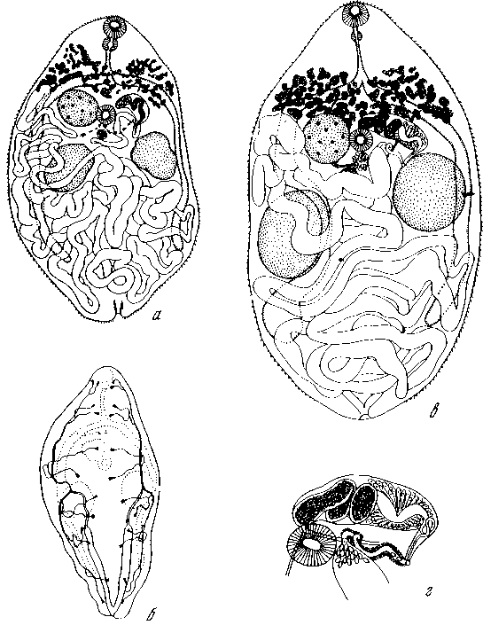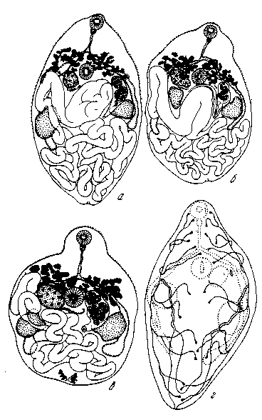 а, б — из кишечника Calotes versicolor (ДРВ), (по Odening, 1964), в, г — из кишечника Hemidactylus brooki (Индия, по Baugh, 1956)