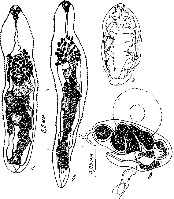 Parabascus semisquamosus (Braun, 1900) a — из Nyctalus noctula (Франция), б — из летучей мыши (Украина), в — строение бурсы, г — выделительная система (а - по Dubois, 1960, б, в — оригиналы, г — по Odening, 1964)