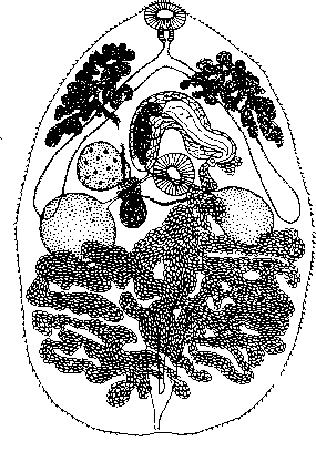 Семенники сильно лопастные, 0,13—0,25 X 0,17—0,31 мм, расположены на одном уровне, постовариальные, интерцекальные. Бурса занимает почти все пространство между ветвями кишечника впереди брюшной присоски. Начинаясь между яичником и брюшной присоской, она идет, изгибаясь, впереди брюшной присоски и открывается половым отверстием вентрально от левой ветви кишечника. Бурса достигает 0,6—0,98 X 0,1 — 0,16 мм. Яичник справа, слаболопастной, 0,14—0,23 X 0,16—0,25 мм, расположен впереди правого семенника, латерально и позади проксимального конца бурсы. Семеприемник овальный, 0,07—0,18 X 0,05—0,14 мм, постацетабулярный, на уровне семенников.