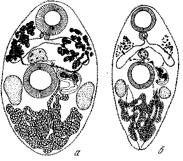 a — из кишечника Tadarida cynocephala (США, по Dubois, 1964), б — по Travassos, 1921