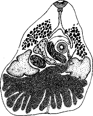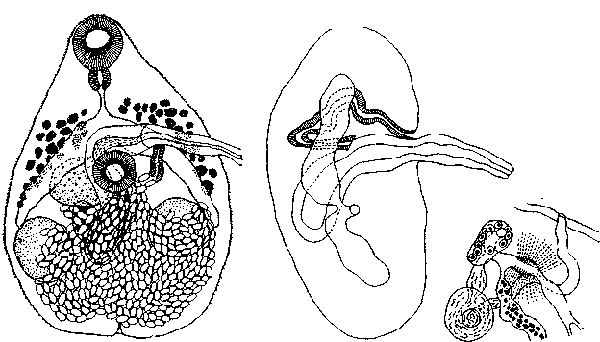 Строение протоков женской половой системы дано. Семеприемник, диаметром 0,02—0,07 мм, расположен кзади от яичника, между ним и семенником. Лауреров канал отходит от семеприемника к дорзальной стенке тела почти под прямым углом. Желточники состоят из довольно многочисленных мелких фолликулов, расположенных двумя полями, которые могут соединяться дорзально. Желточники расположены главным образом латерально от ветвей кишечника в промежутке от конца пищевода до уровня переднего или заднего края брюшной присоски, реже проходят чуть назад. Петли матки расположены в задней части тела, не переходя вперед от уровня яичника. Конечная часть матки образует хорошо развитый, мускулистый, довольно длинный метратерм. Матка забита крупными яйцами размером 0,028—0,031 X 0,013—0,015 мм, с крышечкой на одном из полюсов.