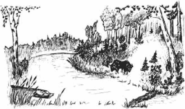 Схематический рисунок лесного ландшафта в хвойно-широколиственных лесах с зоогенными полями, сформированными зубрами и бобровым прудом