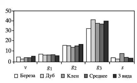По оси абсцисс - онтогенетические (возрастные состояния): v - виргинильное, g1 - молодое генеративное, g2 - средневозрастное генеративное, g3 - старое генеративное, 5 - сенильное