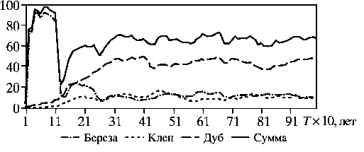 Моделировались три варианта. В первом варианте расчетов скорость роста березы была в два раза меньше нормальной, во втором - нормальной, а в третьем - в два раза больше нормальной. Во всех вариантах моделирования скорость роста клена бралась нормальной. Нормальные значения скорости роста клена и нормальные значения скорости роста березы были взяты из таблиц хода роста чистых насаждений (Нормативы для таксации лесов..., 1992).