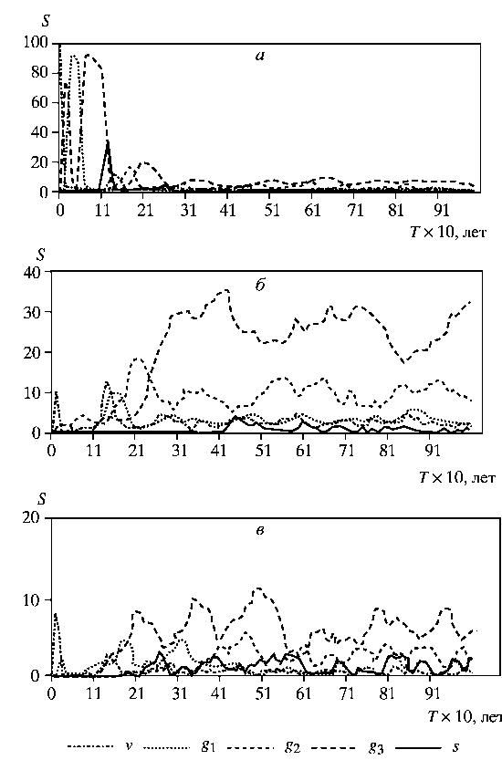 Изменение долей площадей виргинильных, молодых, средневозрастных, старых генеративных и сенильных особей березы (а), дуба (б) и клена (в) в процессе моделирования