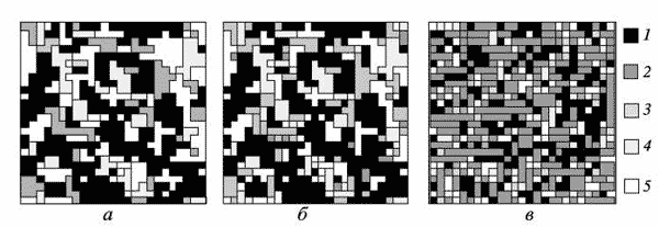 Структура первого (а), второго (б) и третьего (в) ярусов трехвидового лесного сообщества на 75-м шаге моделирования 1 - дуб; 2 - клен; 3 - береза; 4 - смесь видов; 5 - окна
