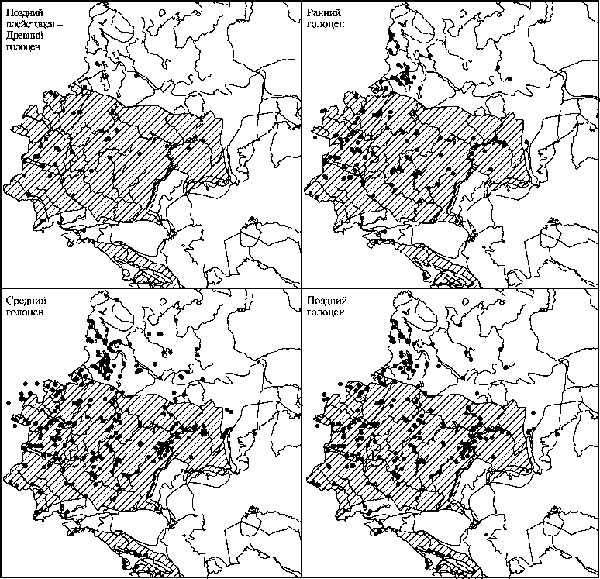 Дуб (большая часть пыльцы относится к Quercus robur или не определена до вида) - основной эдификатор доагрикультурных широколиственных лесов Восточной Европы, его пыльца распространяется недалеко и хорошо сохраняется в различных отложениях (Гричук, 1989; Кожевников, 1995). В древнем голоцене очень мало находок дуба. Его точечный ареал в основном совпадает с суммарным ареалом широколиственных видов (см. дальше). Пыльца дуба присутствует в спорово-пыльцевых спектрах, полученных в северо-западной (Литва, юг Карелии, Архангельская область) и центральной (Тульская, Костромская, Нижегородская, Новгородская, Пензенская, Саратовская области) частях Русской равнины, а также в Причерноморье, на Карпатах и Урале (Пермская область). В раннем голоцене число находок пыльцы дуба больше; ареал его расширился в северном, южном и восточном направлениях. На севере ареал дуба доходил до Кольского полуострова, устья Северной Двины и верховий Печоры; на востоке ареал дуба включает Южный Урал; на юге - Нижнее Поволжье, Причерноморье, Крым и Кавказ. В среднем голоцене границы ареала дуба несколько расширились в северном и восточном направлениях: пыльца найдена на севере Кольского полуострова, в нижнем течении рек Мезени и Печоры, на востоке - в долине реки Тобол. Увеличилось и число местонахождений пыльцы. В позднем голоцене число находок пыльцы дуба меньше, чем в среднем голоцене, но границы ареала в целом не меняются. В этот период не найдена пыльца дуба на севере Кольского полуострова и в Молдавии, где она отмечалась в отложениях среднего голоцена.