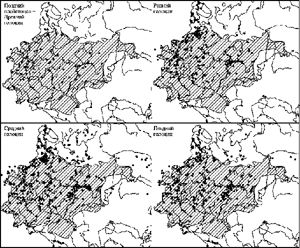 В среднем голоцене число находок пыльцы широколиственных видов возросло еще больше. Территория, где отмечены находки, расширилась в разных направлениях, а также возросла плотность местонахождений. В северной части ареала новые местонахождения зарегистрированы на побережьях Белого и Баренцевого морей; в восточной части ареала - в бассейне Тобола и в северном Казахстане. В позднем голоцене число местонахождений, где найдена пыльца широколиственных видов, меньше, чем в среднем голоцене: так, не обнаружена пыльца этих видов в споро-пыльцевых спектрах в Молдавии, на крайнем севере Кольского полуострова и некоторых других районов, но очертания ареала этого комплекса видов остаются примерно теми же.