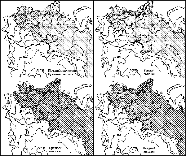 В древнем голоцене ель была относительно широко распространена на территории Восточной Европы. Пыльца ели найдена в северных, западных, центральных и восточных районах Русской равнины, на юге - на Карпатах, в отложениях Азовского моря, в бассейнах Днепра, Дона. По данным М.И. Нейштадта (1957) в раннем голоцене происходит сокращение ареала ели по сравнению с предыдущим периодом. Однако учет новых находок позволяет нам сделать заключение о существенном расширении ареала. На приведенной карте видно, что северные находки (европейская Россия) расположены на побережье Балтийского и Баренцева морей, западные - на Карпатах, южные - на побережьях Азовского и Черного морей и на Приволжской возвышенности. Число находок ели еще более возрастает в среднем голоцене. Добавляются находки в низовьях Печоры, полуостровах Ямал и Гыданский и на Новой Земле, а на юге - в северном Казахстане. Не обнаружена пыльца ели в Молдавии. В позднем голоцене находок пыльцы ели несколько меньше, чем в среднем голоцене: северная граница расположена южнее, чем раньше (пыльца ели не найдена на севере Ямала и на Новой Земле), а южная - севернее (ель не найдена в низовьях Днепра), хотя основная часть ареала такая же, как в среднем голоцене.
