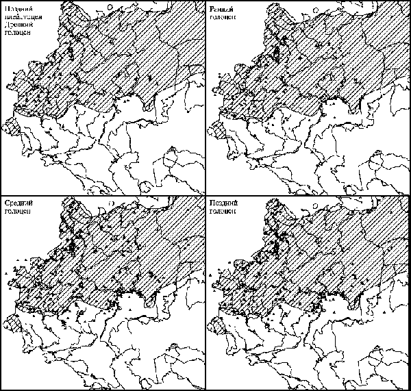 После публикации М.И. Нейштадта (1957) она была обнаружена в отложениях Азовского моря, бассейнов Днестра, Днепра, Припяти и Западной Двины, а также в Карелии, на Кольском полуострове, в бассейнах рек Онега, Вычегда, Мезень, Печора, Нижняя Кама и на Южном Урале. В раннем голоцене ареал темнохвойных видов больше, чем в древнем: добавились находки в Молдавии, Крыму, на Приволжской возвышенности, Урале, в Большеземельской тундре. В среднем голоцене ареал этой группы еще шире, особенно в северном и северо-восточном направлениях: до низовий реки Печора и юга Новой Земли, где ель была отмечена в XIX веке (Пахтусов, Моисеев, 1956). На юго-западе ареал несколько сокращается (пыльца не обнаружена в Молдавии). В позднем голоцене число местонахождений пыльцы темнохвойных видов меньше, чем в среднем, ареал принципиально не меняется.