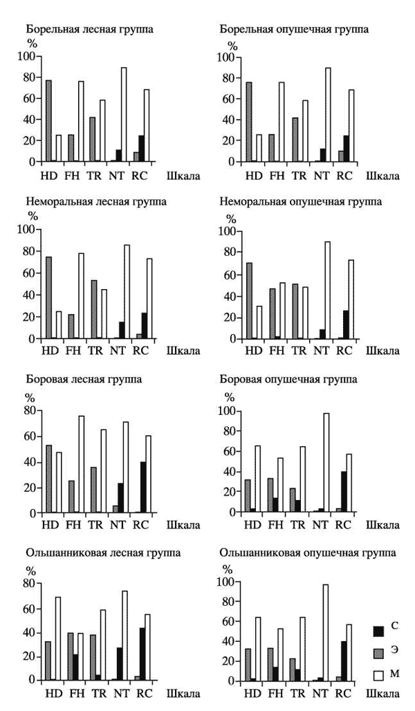 Полное доминирование мезовалентных фракций во всех ЭЦГ выявлено по шкалам кислотности почвы (RC) и богатства почв азотом (NT). В последнем случае в бореальной опушечной ЭЦГ отмечен единственный вариант спектра, когда все виды принадлежат М-фракции.