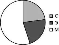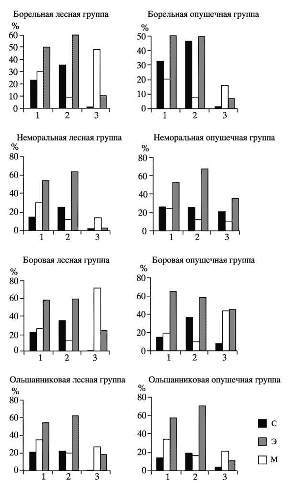 Доли участия стено- (С), эври- (Э) и мезовалентных (М) видов разных ЭЦГ по отношению к группам климатических (1), почвенных (2) факторов в целом и к фактору освещенности-затенения (3)