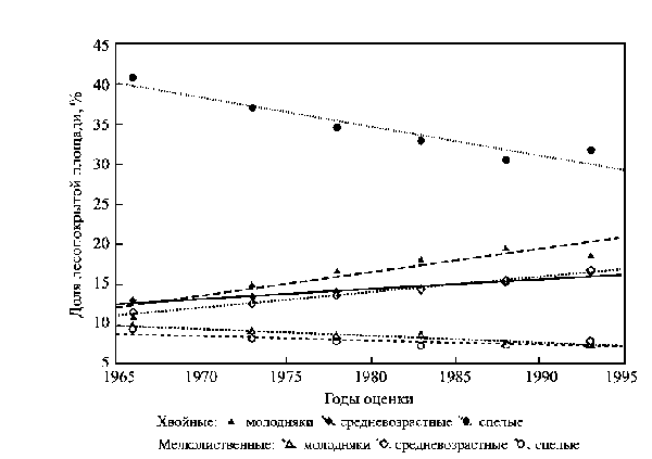 Динамика лесопокрытых площадей, занимаемых хвойными и мелколиственными древостоями различных групп возраста в Европейской России