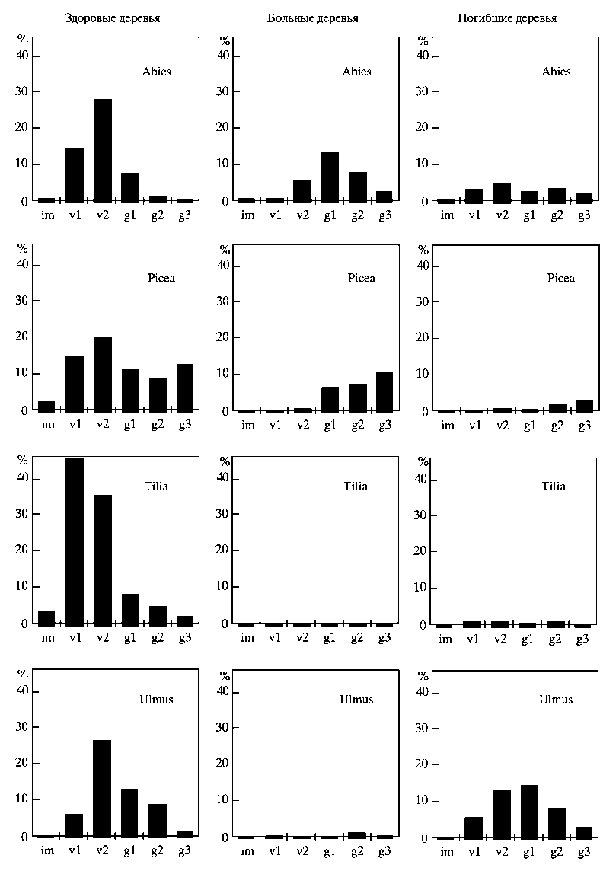 Динамическое представление о влиянии биотических агентов (грибов и насекомых-ксилофагов) на структуру исследуемых лесов дают оценки доли пораженных деревьев в возрастных спектрах их популяций.