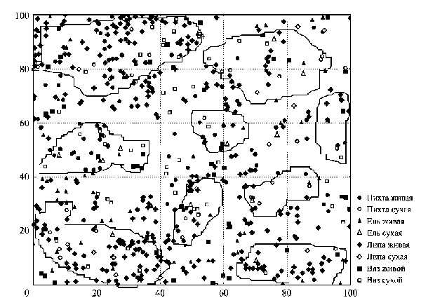 Размещение живых и сухих особей древесных видов, образующих основной полог древостоя на пробной площади № 1 в Сабарском заказнике. Ломаной линией выделены очаги усыхания ели и пихты верхних ярусов
