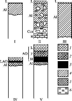 Морфология типов гумуса аэрированных лесных почв: 1 - слаборазложившаяся подстилка, 2 - полуразложившаяся подстилка, 3 -темный органический горизонт без видимой структуры, 4 - смешанный горизонт со стабильными органо-минеральными агрегатами, 5 - смешанный горизонт без стабильных органо-минеральных агрегатов, 6 - подвижные карбонаты кальция. Тип гумуса: I - кислый мюлль; II - карбонатный мюлль; III - андиковый (темноцветный) мюлль; IV - модер; V - мор (по Дюшофуру, 1998)