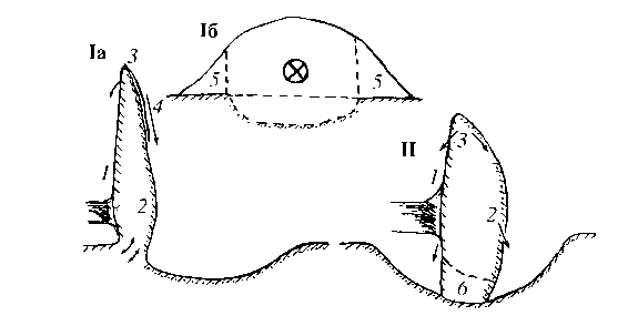 Типы ветровальных почвенных комплексов: 1а, 16 - непровернутый (в разных проекциях), II - провернутый. Элементы строения вывального бугра ВПК: 1 -дневная поверхность (передняя плоскость бугра), 2 - выпуклая (задняя) часть кома, 3 - гребень, 4 - бахрома корней и подстилки, 5 - “крылья”, 6 - якорная часть (по Пономаренко, 1999)