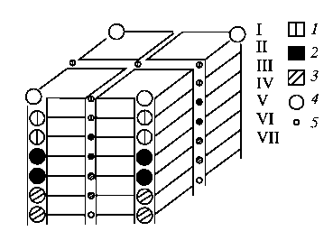 Схема осаждения частиц из суспензии в вертикальных каналах миграции: 1 - осветленная пыль, 2 - ил, 3 - коллоиды, 4 - каналы миграции I порядка, 5 - каналы миграции II порядка. I—VII - последовательные по глубине слои (по Пономаренко, 1990).