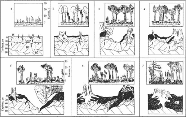 Для первого поколения деревьев характерен синхронный, массовый ветровал, являющийся следствием неустойчивости деревьев, выросших на пашне, к грибным заболеваниям. Такая неустойчивость часто отмечается и для следующего поколения, в случае, если оно монодоминантно (последнее зависит от возможности поступления зачатков различных видов). В дальнейшем все более увеличивается асинхронность оборачивания различных участков вывалами; увеличивается глубина оборачивания в связи с освоением корнями деревьев подпахотной толщи. Часто действие антропогенных факторов прерывает протекание восстановительной сукцессии на этом или более раннем этапе. В результате сформировавшиеся в ходе сукцессии крупные каналы миграции в дальнейшем заполняются преимущественно осветленным материалом верхних горизонтов, тем самым увеличивается мощность осветления профиля.